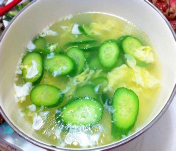 方法五 原料:黄瓜150克,鸡蛋2个,胡萝卜少许,盐1/2茶匙(3克),油1茶匙(5ml)做法:1黄瓜切成片,鸡蛋打散在碗中 ;2将切片的黄瓜再切成段,鸡蛋搅拌好备用;3锅中放少许油和适量的水,水开后,倒入黄瓜片;4水再次开后,倒入打散的鸡蛋;5最后放几片胡萝卜片点缀,放适量的盐即可;6盛出装在碗中即可食用。