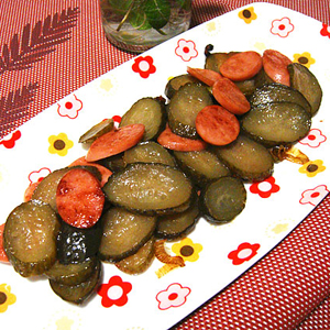 6、直到看到火腿肠片表面有点微焦的时候,赶紧加入酸黄瓜片翻炒1分钟。