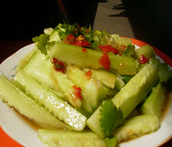 ②烫好的黄瓜摆入玻璃盆或其它适合的容器内,将准备好的各种调料撒上,再撒少量的精盐,然后将调料与黄瓜搅拌均匀。