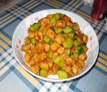 炒到肉中透出酱的香味时,加入绍酒、鸡精、酱油稍炒,放进黄瓜,颠炒几下,浇上香油,即可出锅食用了。