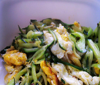③锅中放油,倒入葱花炝锅,倒入黄瓜片翻炒几下后倒入炒好的鸡蛋,将黄瓜与鸡蛋翻炒均匀。