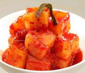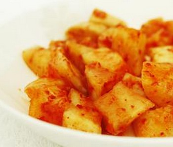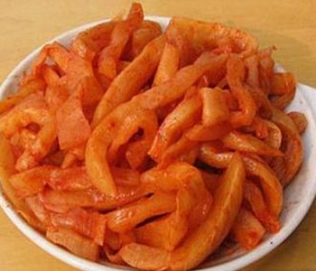 朝鲜人都喜欢吃他们自己家腌制的萝卜咸菜,如果哪一天没有在饭桌上看到它,都会觉得奇怪呢!特别是他们在吃炸酱面、喝牛尾汤时是必不可少的哟!是不是也想尝试做一道地道的朝鲜美食?