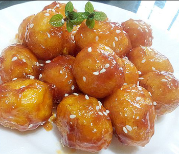 2)烧锅下油至油温100度,放入鹌鹑蛋炸至金黄色时,捞起摆入碟内,跟椒盐、鸡汁佐食。
