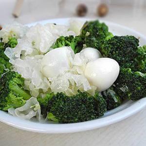 原料:西兰花150克、干银耳15克、鹌鹑蛋6-8个、水淀粉适量、盐适量