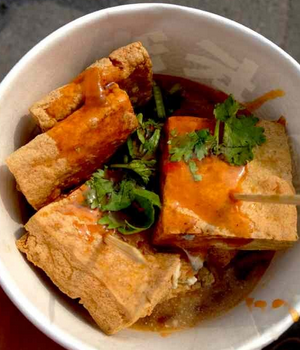 臭豆腐最佳的吃法就是油炸,然后淋上或灌入秘制的辣椒酱汁,颜色鲜艳,食指大动。