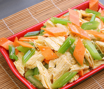 腐竹,又称腐皮,是煮沸豆浆表面凝固的薄膜,可鲜吃或晒干后吃,是常见的食物原料,作为高蛋白的食品,深受大众欢迎。腐竹加工始于唐朝,距今已有1000多年的历史了哦,在四川也称豆皮、豆腐皮。它具有浓郁的豆香味,同时还有着其他豆制品所不具备的独特口感。关于腐竹的家常菜有很多,下面做菜网百科来教大家一种非常简单的,那就是凉拌腐竹丝。