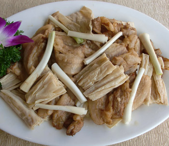 3 腐竹用水泡开、泡软,切成小段;大蒜切片,葱花切细。