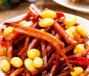 4、下豆子、花生、萝卜干炒。加水没过豆子,倒酱油、花椒大料。大火烧开,转中火,至汤干起锅加盐;
