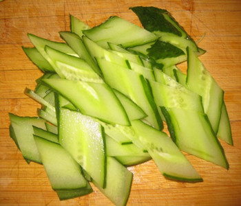 (2)黄瓜洗净后切成细条,把腐竹和黄瓜放入碗中,加入醋、酱油、白糖、盐和香油搅拌均匀即可