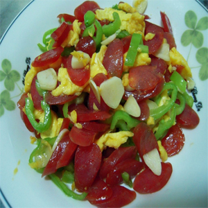 5、香肠含淀粉比较多,可以在炒鸡蛋的时候适当加入一些绿色蔬菜,例如黄瓜、蕃茄。这样吃起来不但美味,而且营养也会均衡些。
