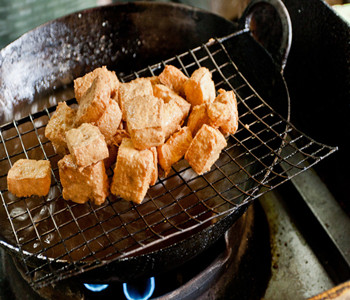 (5)锅里下油烧沸,逐块地放入卤好的豆腐,炸约5分钟,炸成外焦内嫩后捞出;
