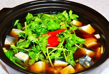 做法:(1)用冷水15千克,放入豆豉3千克,烧开后再煮半小时左右,然后将豆豉汁滤出。待豆豉冷却后,加入食用碱、明矾、香菇、笋、盐、白酒以及豆腐脑,浸泡约半个月左右(每天搅动一次),发酵后即成卤水。