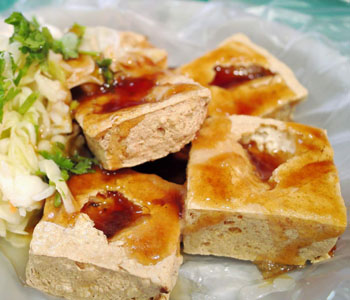 台湾臭豆腐,台湾的臭豆腐源自大陆,但是经过多次改良由有别于大陆的臭豆腐。其表面酥脆,而里面有很多细孔。和大陆北方的臭豆腐闻着臭吃着香的特点不同的是,台湾臭豆腐外面臭里面也臭。台湾臭豆腐在食用是要配上专门的泡菜,酱汁也与大陆的不同,颇有独特的地域风味。