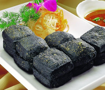 长沙臭豆腐,其特点为初闻臭气扑鼻,细嗅浓香诱人。臭豆腐地区的差异主要体现在卤水的差异上,长沙臭豆腐的卤水配料,是采用豆豉、纯碱、青矾(慎用,这是商家为了提高发酵效率而采用的)、香菇、冬笋、盐、茅台酒等共同煮制而成。用黑豆豉煮沸,冷却后加冬菇、冬笋、白酒等作料,浸泡15天。所以长沙臭豆腐的颜色多为黑色。
