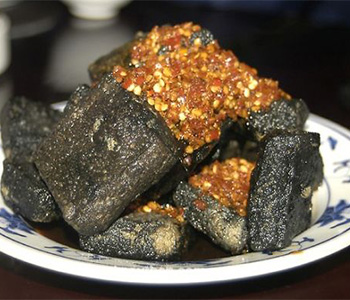 臭豆腐的食品添加剂:臭豆腐所用的添加剂有色素、消泡剂、防腐剂、凝固剂等。添加剂过量会造成重金属超标,消费者食用会导致中毒,由此造 成的重金属中毒事件屡见不鲜。其中,化工原料绿矾似乎成了制作臭豆腐不可缺少的原料,绿矾也叫皂矾,化学名称为硫酸亚铁。硫酸亚铁通常用 于制造工业材料、自来水净化和工业废水处理、饲料添加剂,用不纯的硫酸亚铁处理豆干表面并发酵,可以产生化学反应,生成黑色的硫化铁,这 就是使臭豆腐表面呈黑色的原因。不过,“由于硫酸亚铁在和这些菌、酶等发酵物接触时会迅速发生化学反应,这个过程中会产生许多对人体有害 的化合物。“闻着臭,吃着香”,其臭味是由于发酵后一部分蛋白质的硫氢基和氨基酸游离出来产生硫臭和氨臭。硫化物主要是硫化氢,硫化氢为 无色并具有腐臭味的气体,极毒,人吸入后会引起头痛、眩晕,大量吸入会严重中毒,这无疑又大大增加了臭豆腐的安全隐患。