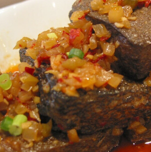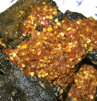 炸好后捞出来控油,放在碗里,倒入麻酱蘸料,撒上蒜蓉和辣椒粉就可以吃到臭喷喷的臭豆腐啦。