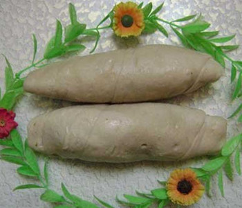 水面筋是物性蛋白质,有麦胶蛋白质和麦谷蛋白质组成。将面粉加入适量水、少许食盐,搅匀上劲,形成面团,稍后,用清水反复搓洗,把面团中的活粉和其它杂质全部洗掉,剩下的即是面筋,将洗好的面筋投入沸水锅内煮80分钟至熟,即是“水面筋”。