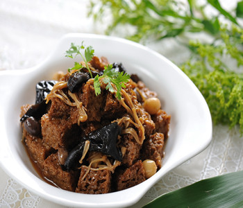 烤麸:将湿面筋平摊在蒸笼中,厚度为2~3厘米,加热30分钟。一般,蒸个20分钟左右,就可以看到一个大“发面饽饽”出来了,捏起来软软的,一松手又回到原来的样子,像个大海绵。然后,把大发面饽饽切成小块,然后就可以放到炖肉锅里啦!肉锅里的它能像海绵一样饱吸汤汁,并且久煮也不会碎烂。我们还可以用它拌凉菜的,吃起来有点冻豆腐的感觉,但又没有那股豆腥气,嚼起来筋筋刀刀的把它做涮锅的原料也是相当地好的,可比那由几十种添加剂做成的鱼丸强得多了。