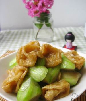 丝瓜——翠绿鲜嫩,清香脆甜,加上油面筋——个个金黄,红辣椒的开胃和点缀,这道菜顿时让人食欲大增。加上丝瓜是夏季人们常食的蔬菜,《本草纲目》记载,丝瓜性寒味甘,能除热利肠、去风化痰、凉血解毒、通经络、活血脉、下乳汁,可治疗、咳嗽、水肿、奶水不通、脚温气、斑秃等疾病。材料容易取得,做法简单,又可以多食用。这样一道鲜美的丝瓜炒面筋会是你最爱吗?