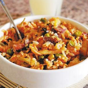 做法:先把大米淘洗干净,放在水里泡一会儿,然后把香肠切成薄片,把豌豆洗干净。把大米、香肠和豌豆放在一起,并加入适量的水,把它们放入电饭锅中焖制,一直焖制到电饭锅的加热灯跳起来,然后还要继续保温10分钟才能断电。最后等到吃的时候打开锅搅拌均匀即可。