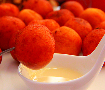 4、手上抹油拿起拌好的地瓜泥,包入切成花生粒儿大小的马苏里拉奶酪,然后团成丸子状。