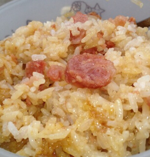 然后第二天一早就把泡好的糯米和粘米以8:2咧比例混合在一起上锅蒸,等到“生米蒸成熟饭”以后,就要趁热加入酱油和猪油拌匀。一定要趁热哦,不然糯米饭冷了就坨在一起了,拌不匀。
