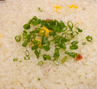 最后吃的时候把事先准备好的蛋皮丝、葱花、油辣椒、凉拌折耳根、花生米等作料包在饭中就可以了。