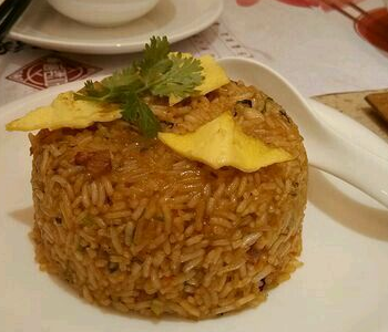 菠萝饭,外型是一只完整的菠萝,形状美观大方。菠萝壳内是菠萝肉与糯米饭紧密结合的柔软饭团,米饭带 有明显的菠萝味,是一种风味独特的食品。