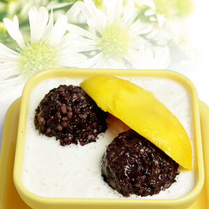 材料:芒果1个、黑糯米100克、芒果冰激凌50克、椰浆150ML、淡奶油30ML、细砂糖25克。