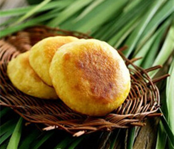 2、平底锅中倒入油,小火烧至六成热,取适量粉团,用手拍成小圆饼状,放入锅中,煎至两面呈金黄色取出。