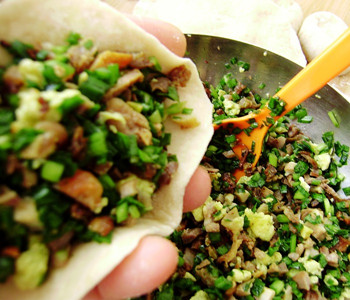 8、把剂子按到中间厚,周围薄,然后包上馅料。