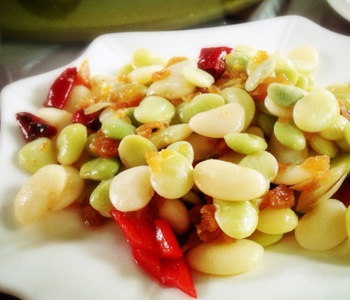 主料:扁豆(白)500g、食盐适量、调和油适量、洋葱适量、红椒适量