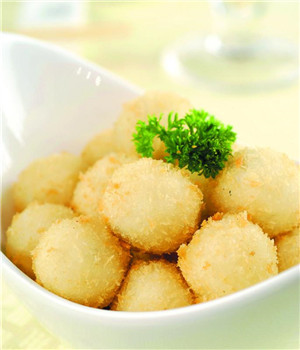 4、将包好的汤圆沾上鸡蛋液,再在面包糠中滚一下,使表面均匀地裹上面包糠。