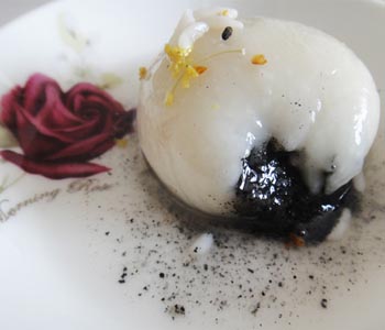 做法:先将黑芝麻炒熟,碾碎,拌上猪油、白砂糖,这三者的比例大概是2:1:2,往糯米粉中加水和成团,揉搓成长条,用到切成小块,然后将小块糯米团逐一在掌心揉成球状,再使用拇指在球顶压一个小窝,拿筷子挑适量的芝麻陷放入,再使用手指逐渐捏拢窝口,再放在掌心轻轻地搓圆,接着将锅中的水烧至沸腾,放入包好的煮至浮起即可。