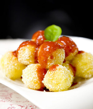 7、锅中留少许油加入番茄酱,带番茄酱冒泡时浇入炸好的土豆球上即可食用。