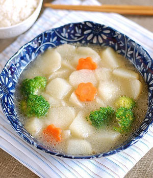 2、将西兰花放入高汤中焯3分钟,捞起沥干。