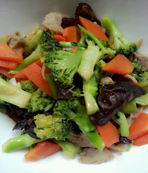 原料: 西兰花200g,肉片100g,胡萝卜50g,黑木耳20g,油适量,盐适量,鸡精适量