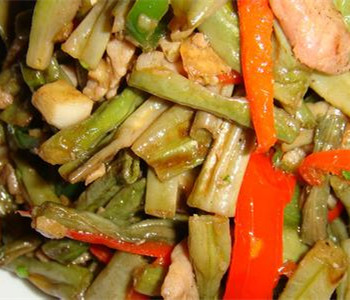 2、炒锅洗净置旺火上,放油烧至七成热,下豇豆,炸至皱皮时捞出,沥干油份待用。