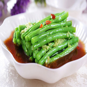 食材:豇豆250g、蒜、芝麻酱、香油、盐、糖、鸡精、醋、辣椒油各适量。