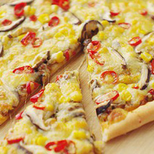 20、铺上香菇片,玉米粒和美人椒,再铺一层马苏里拉奶酪