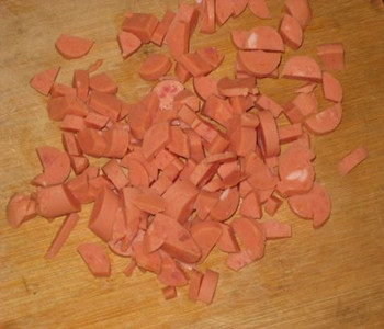 2、将火腿肠切成指甲盖大小的丁,然后放入盘子中备用。