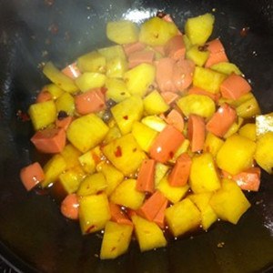 4、土豆丁炒熟之后,放入火腿肠丁,一起炒制,放入适量的盐、味精,就可以出锅了。