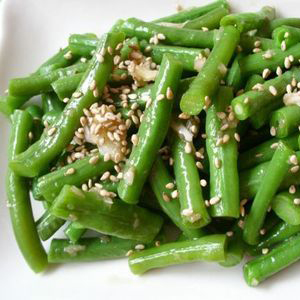 5、将油浇入豆角中。加盐、糖、蒜泥,醋、鸡精、香油拌匀,撒上一些芝麻,一道清脆爽口的小凉菜就做好了。