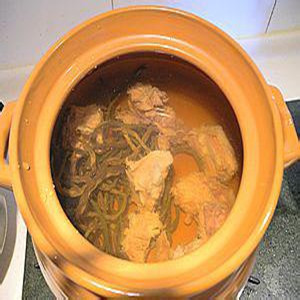 8.1小时后,将豆角段放入,炒匀,继续炖约20分钟,中间翻炒几下,让豆角入味均匀,根据口味加适量盐即可。