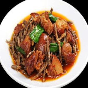 食材:五花肉500g、干豇豆80g、大料4粒、葱一根、姜一块、冰糖15g、生抽10mL(毫升)、老抽10mL、盐适量。