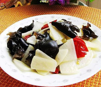 3、 花生油倒入炒锅中烧热,放入萝卜翻炒,再放入葱段、姜片、白糖、精盐、浸发木耳和味精,炒拌均匀即可。