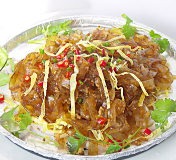 然后将粉条用水煮软捞出,沥干,用剪刀剪几下;