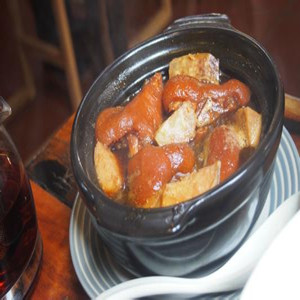 7. 倒入炸好的芋头块,再焖约20分钟,最后加鸡精、胡椒粉拌匀,拣出香料袋,装盘即可。