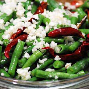 2、开大火,炒锅内倒油,油温六成热时倒入豆角姜丝翻炒,变色放入花椒、干辣椒不停翻炒,待快成熟时放入食盐和鸡精翻炒,均匀起锅盛盘即可。
