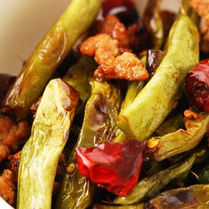 3、手撕豇豆,肉馅加少许老抽,生抽,料酒腌制20分钟待用。豆角洗净从中间切一刀,下热水里焯熟,捞出后立刻浸泡凉水,控干水份后,用手把豆角从中间撕成两半。锅里热油,下葱姜爆香,入腌制好的肉馅,立刻划散,不停的翻炒均匀盛出备用,用锅内剩的底油,加蒜末爆香,放入豆角,翻炒2分钟,再放入炒好的肉馅,再调入盐,鸡精出锅即可。